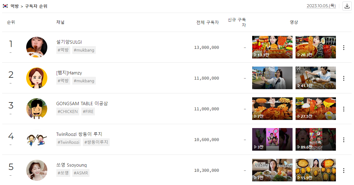 이럴수가 한국에 먹방으로 천만 유튜버를 찍은 사람이 5명이나 있다니 정말 대단하다.