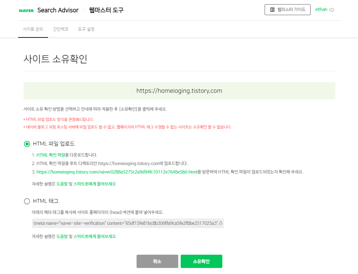 사이트를 입력하면 HTML 파일을 업로드하거나, HTML 태그를 삽입해 사이트 소유확인을 진행할 수 있다.