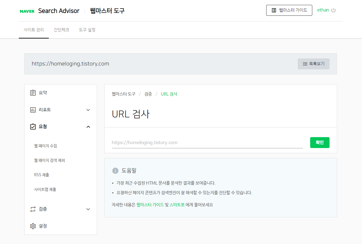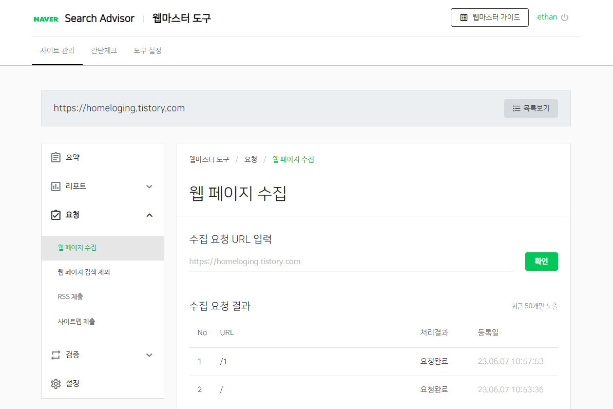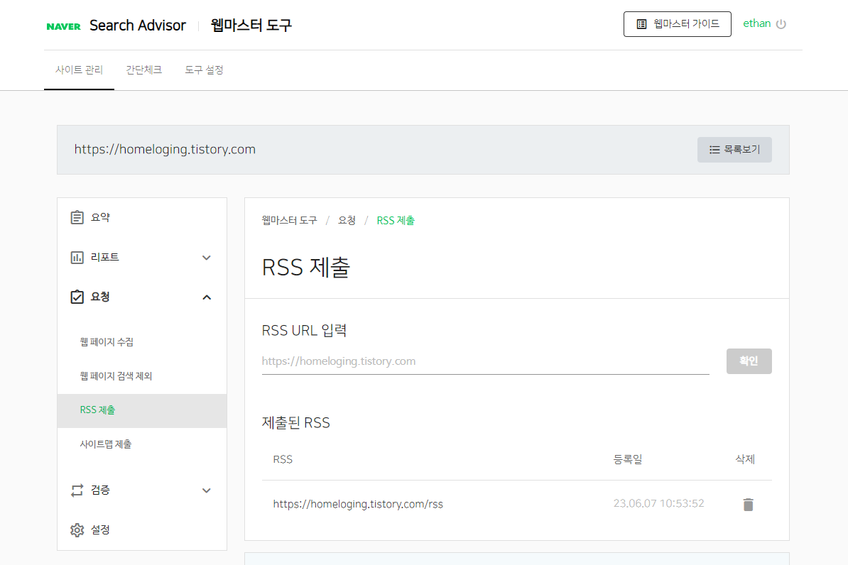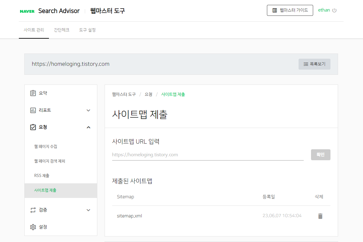 좌측 탭에서 '요청'을 클릭하여 웹페이지 수집 / RSS 제출 / 사이트맵 제출을 해야한다.