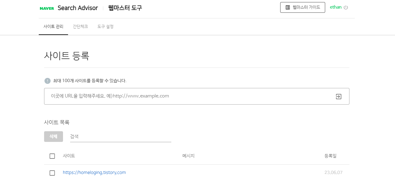 상단의 웹마스터 도구를 클릭하면 사이트를 등록할 수 있다.