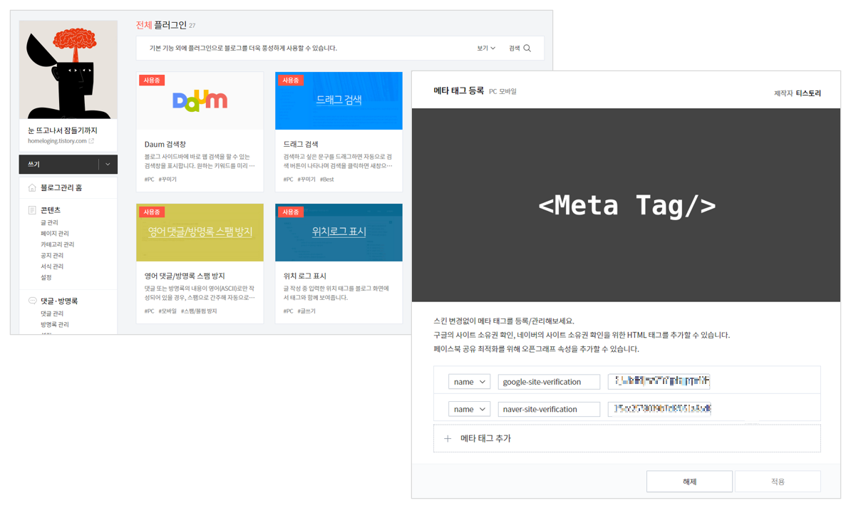 메모장에 복사한 태그에서 'meta name'의 내용과 'contents'의 내용을 각각 넣어주면 적용할 수 있다.